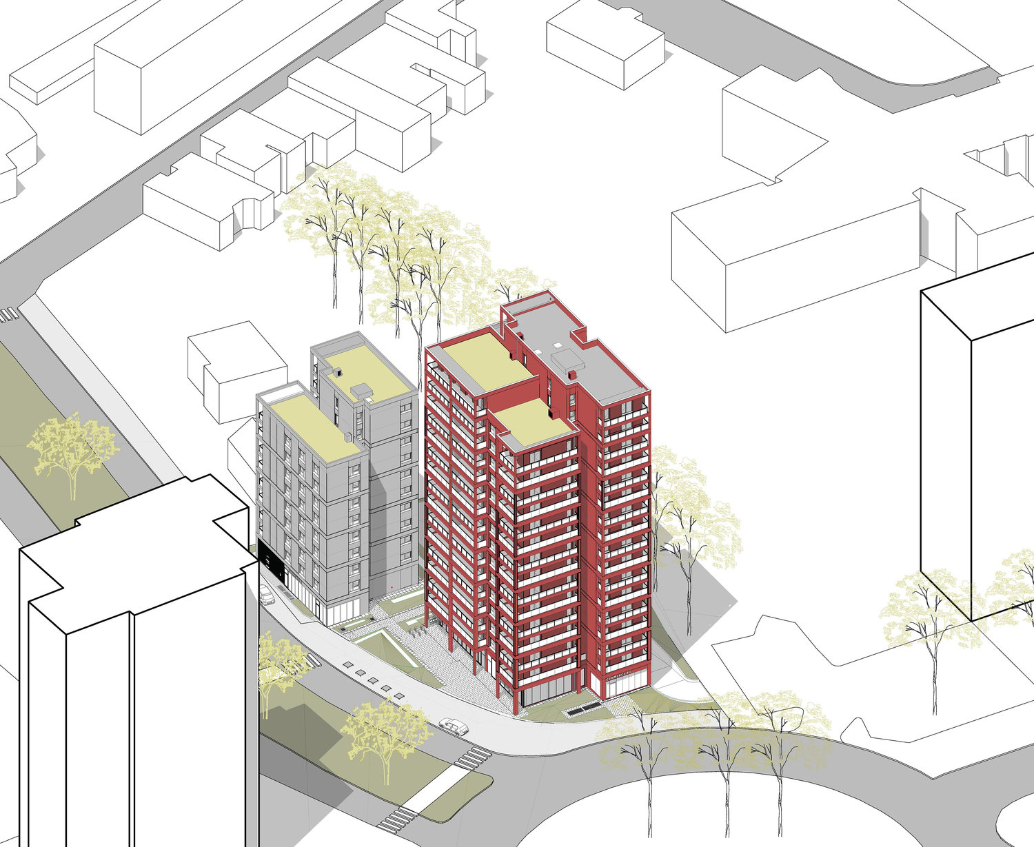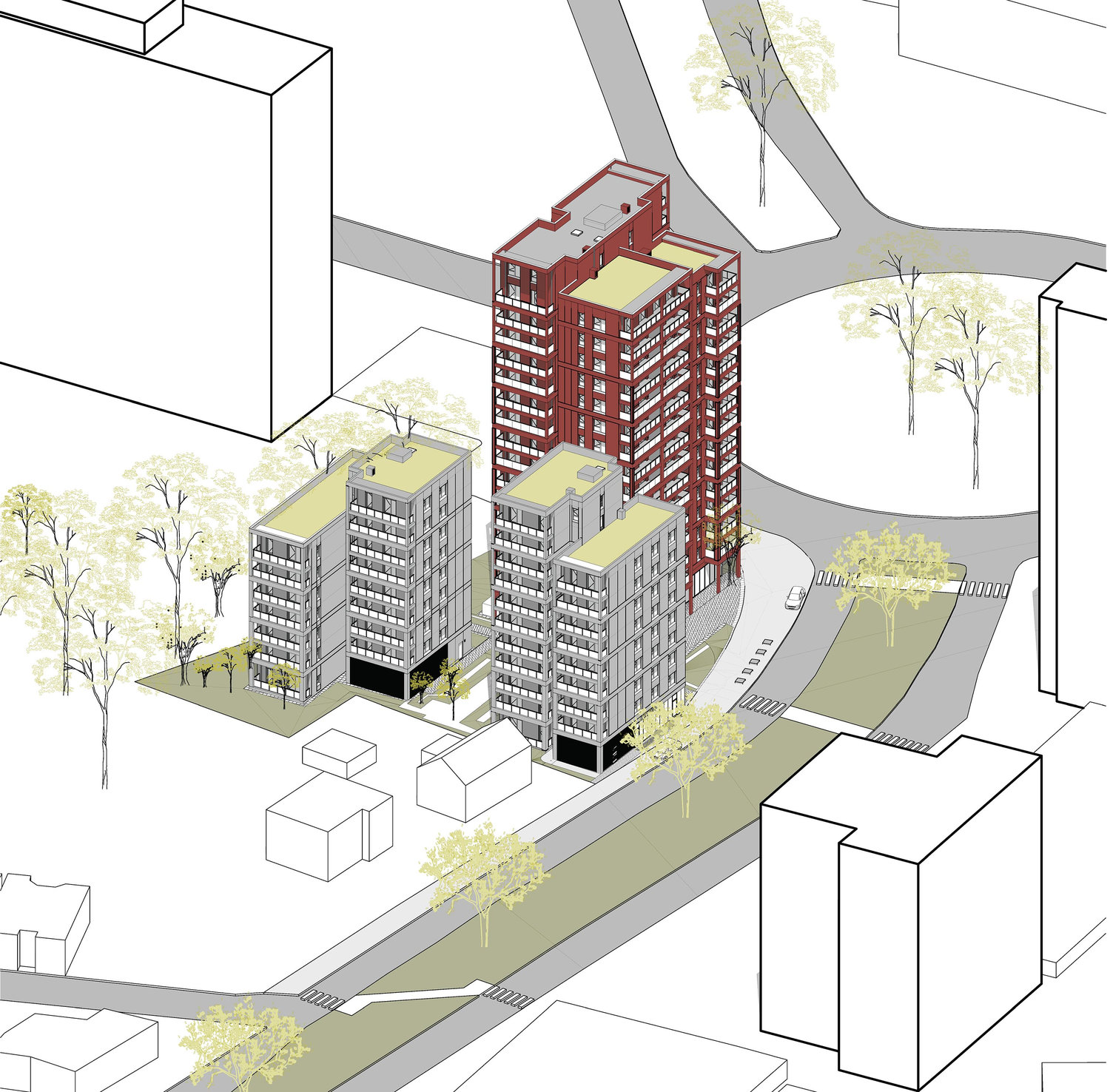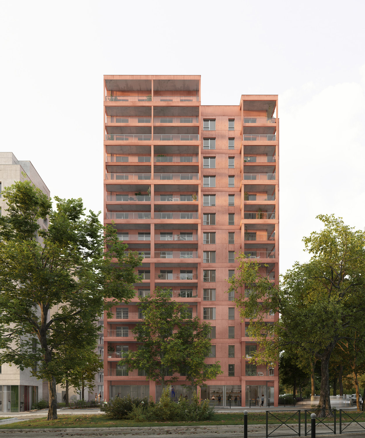 programme : 107 logements collectifs (61 accession libre + 39 locatif social + 7 accession sociale) + commerces + parking