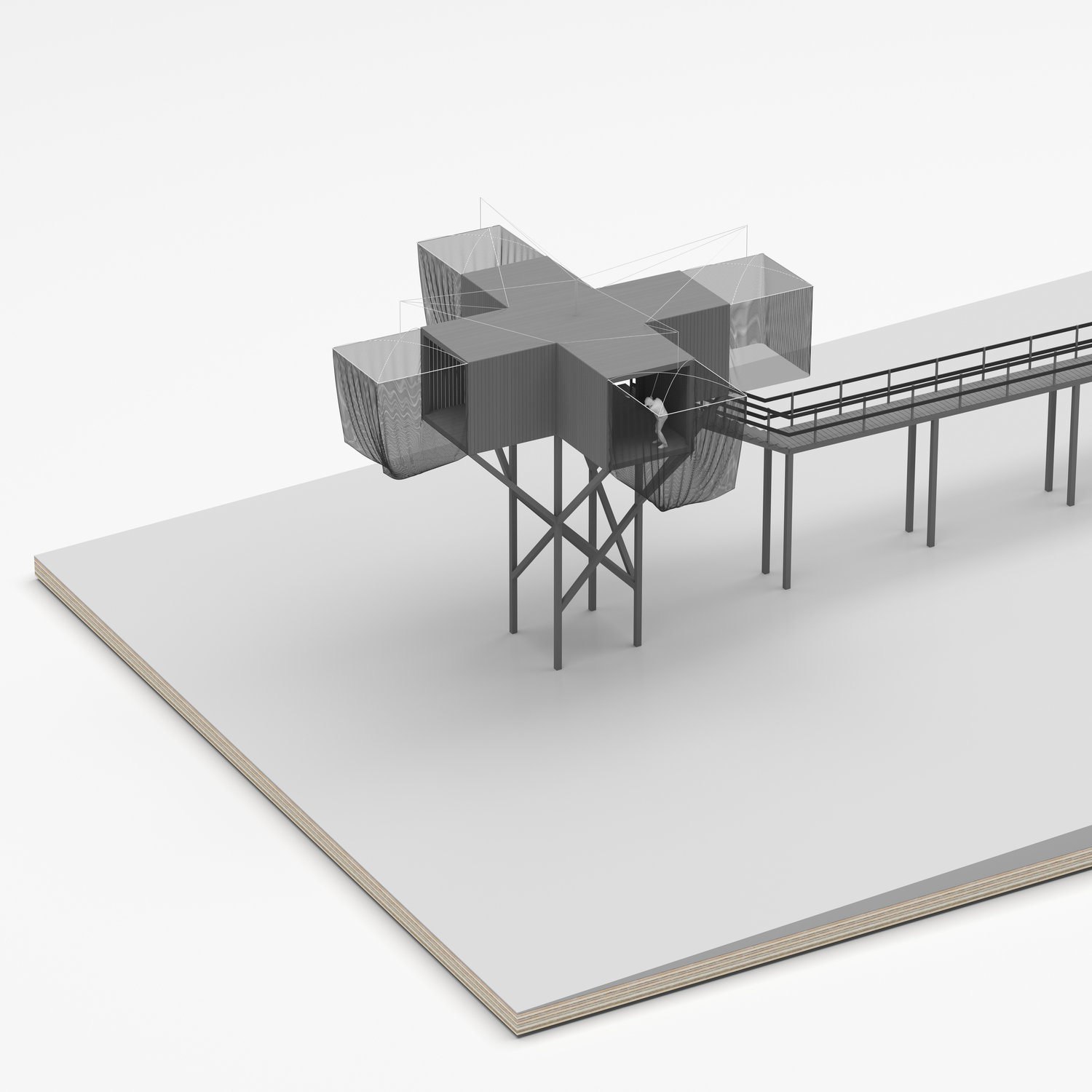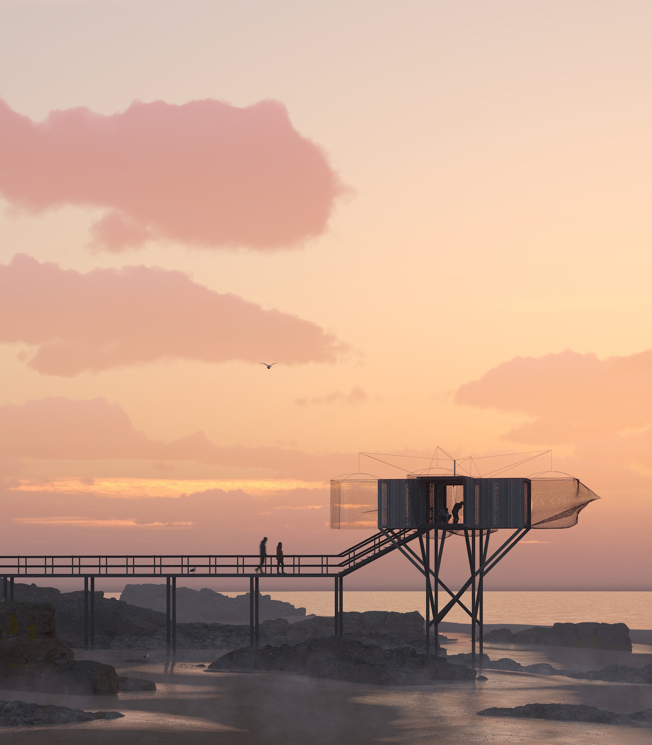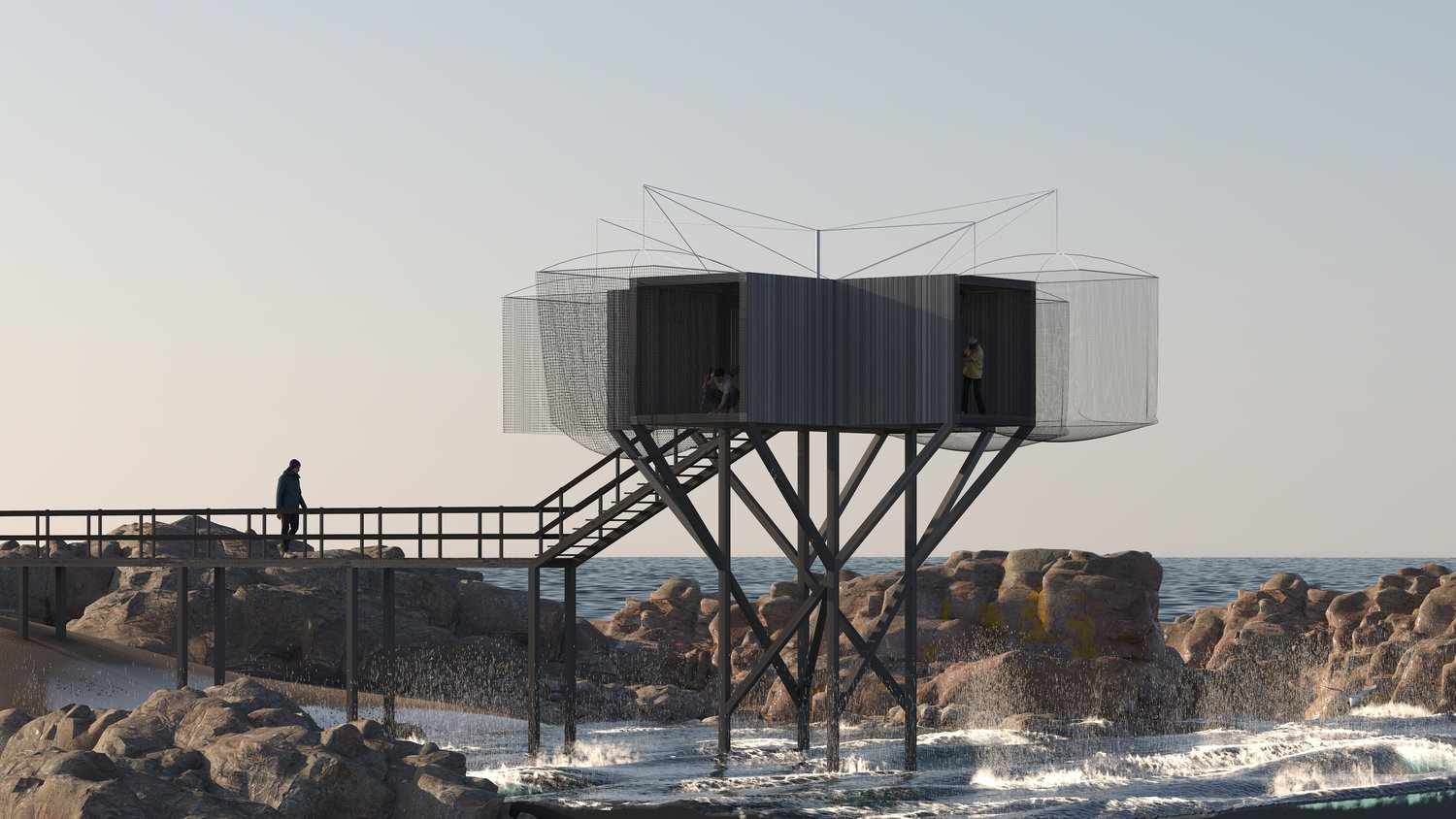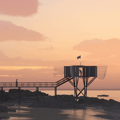 programme : Rencontre entre la pratique urbaine du golf et l’architecture des pêcheries. la structure se pose dans un espace dégagé avec vue sur l’horizon. elle accueille 3 espaces de practice, les filets munis de cibles servent de lieu d’entrainement, un système de caméra et d’écran permettent de reproduire la trajectoire de la balle permettant de réaliser un parcours de 18 trous.