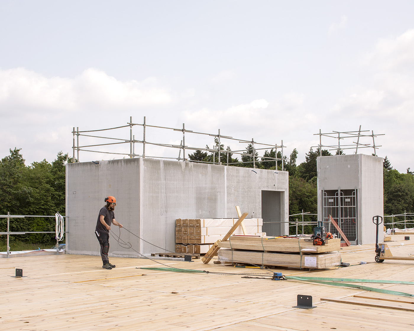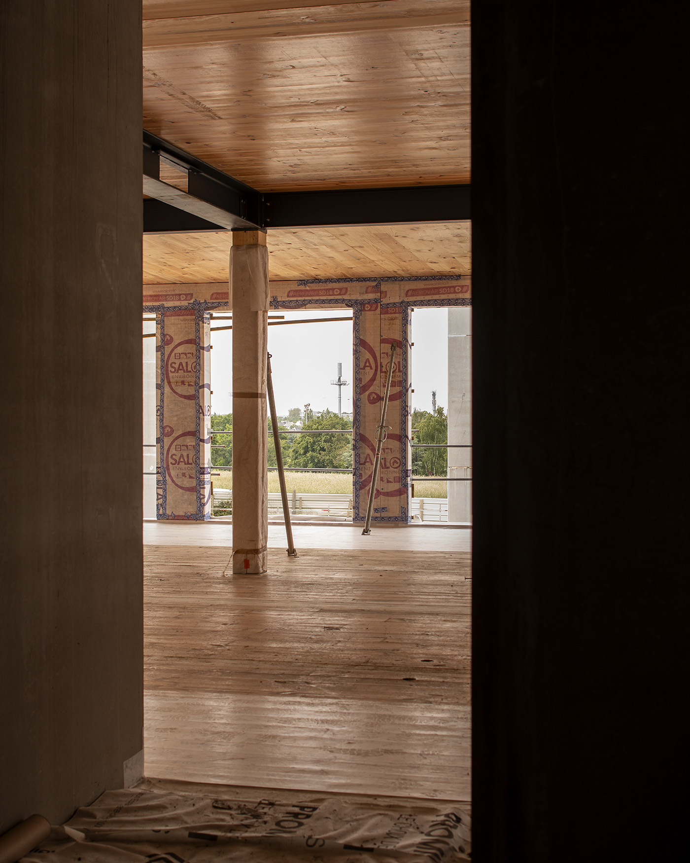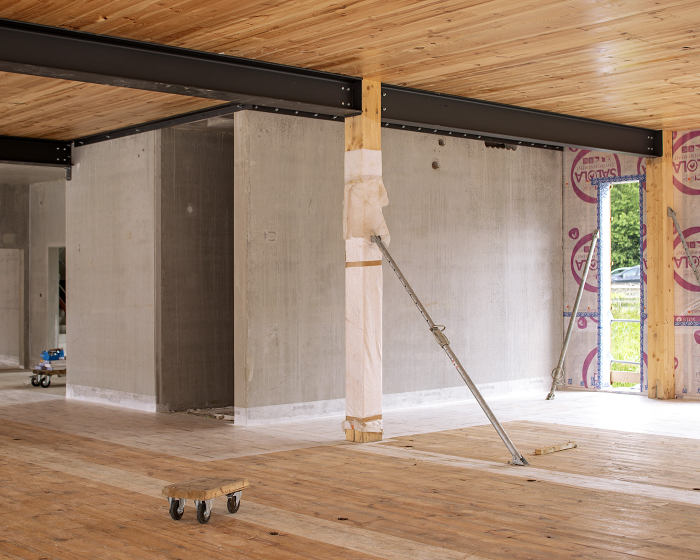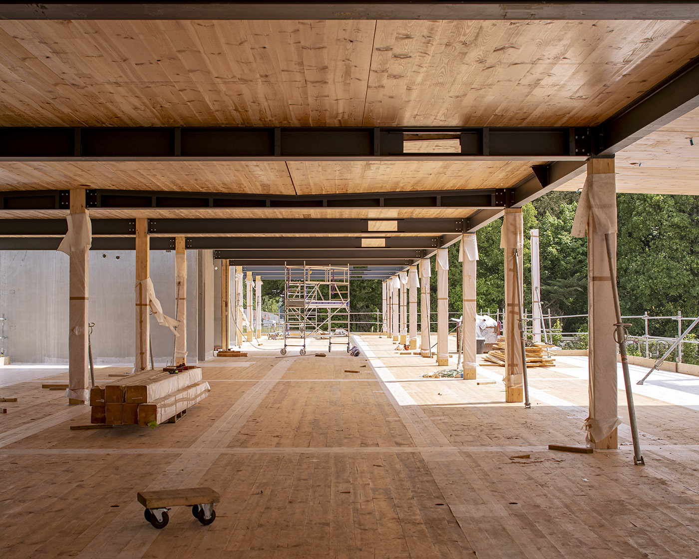Ensuite, le métal est utilisé sous différentes formes, l’acier pour les poutres structurelles des plateaux, l’aluminium pour les menuiseries extérieures et la serrurerie des garde-corps et couvertine, le zinc naturel pour la couverture et descentes d’eaux pluviales. Enfin, le béton est utilisé ici ponctuellement dans le traitement des soubassements et des noyaux verticaux, permettant ainsi la stabilité de la charpente bois.