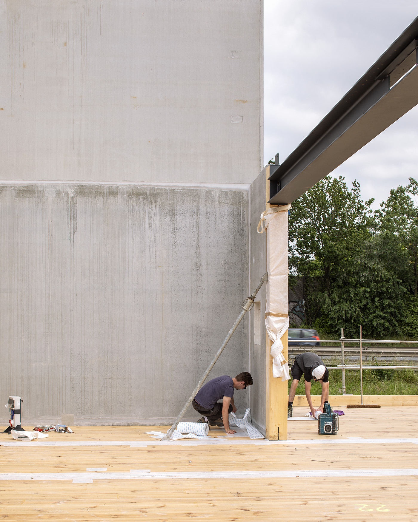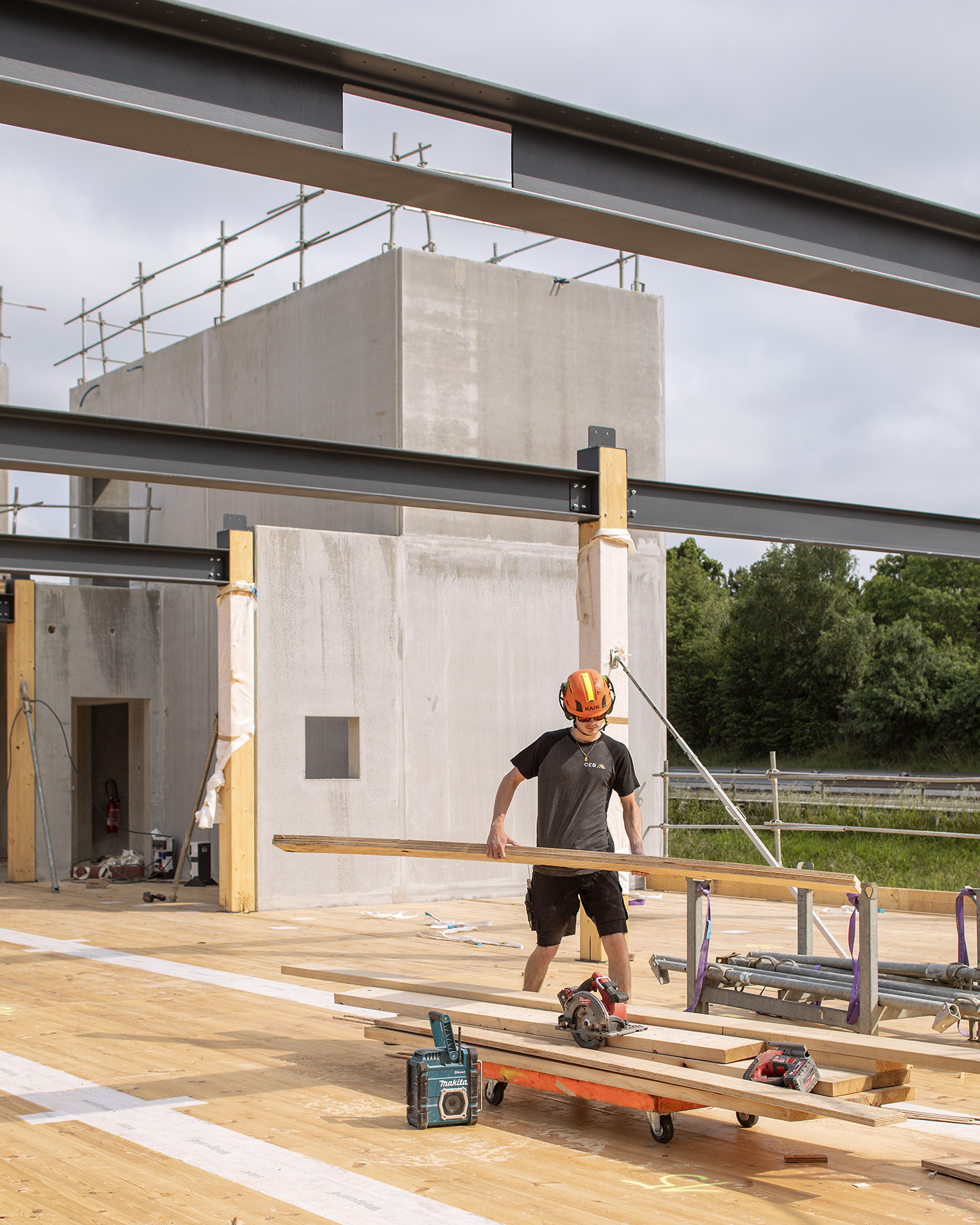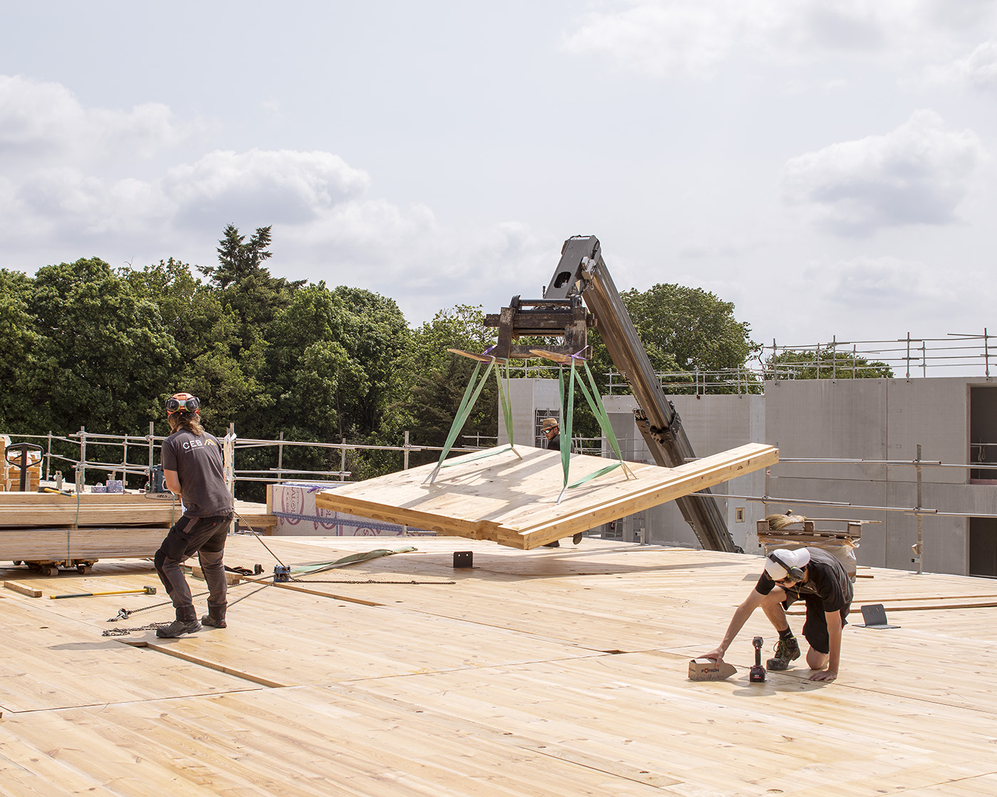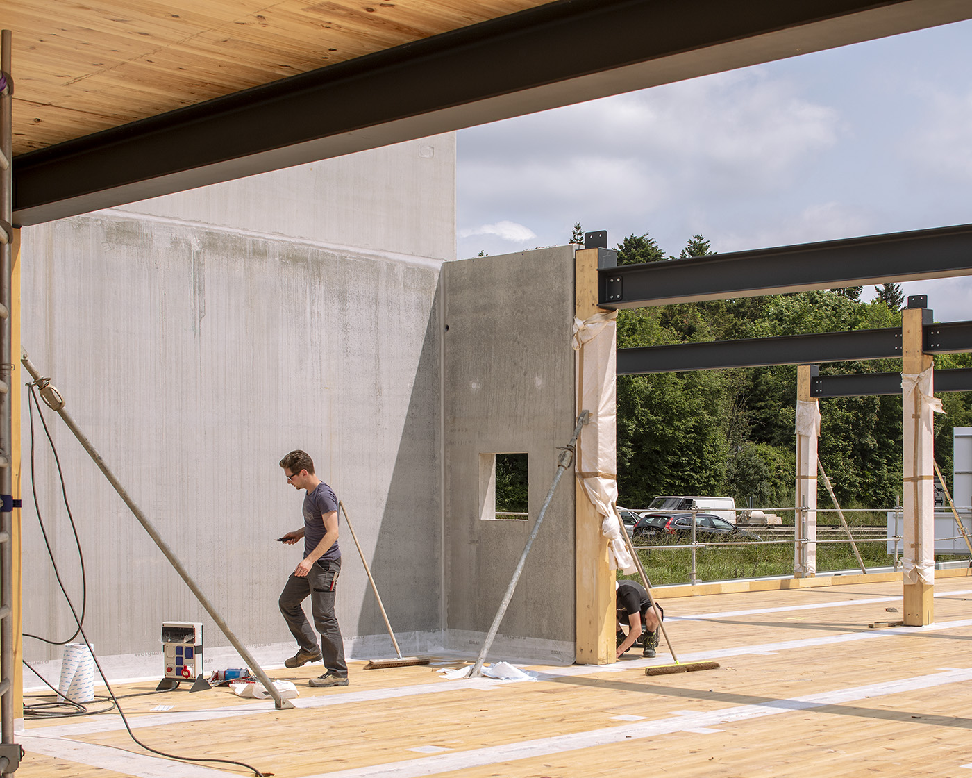 Ensuite, le métal est utilisé sous différentes formes, l’acier pour les poutres structurelles des plateaux, l’aluminium pour les menuiseries extérieures et la serrurerie des garde-corps et couvertine, le zinc naturel pour la couverture et descentes d’eaux pluviales. Enfin, le béton est utilisé ici ponctuellement dans le traitement des soubassements et des noyaux verticaux, permettant ainsi la stabilité de la charpente bois.