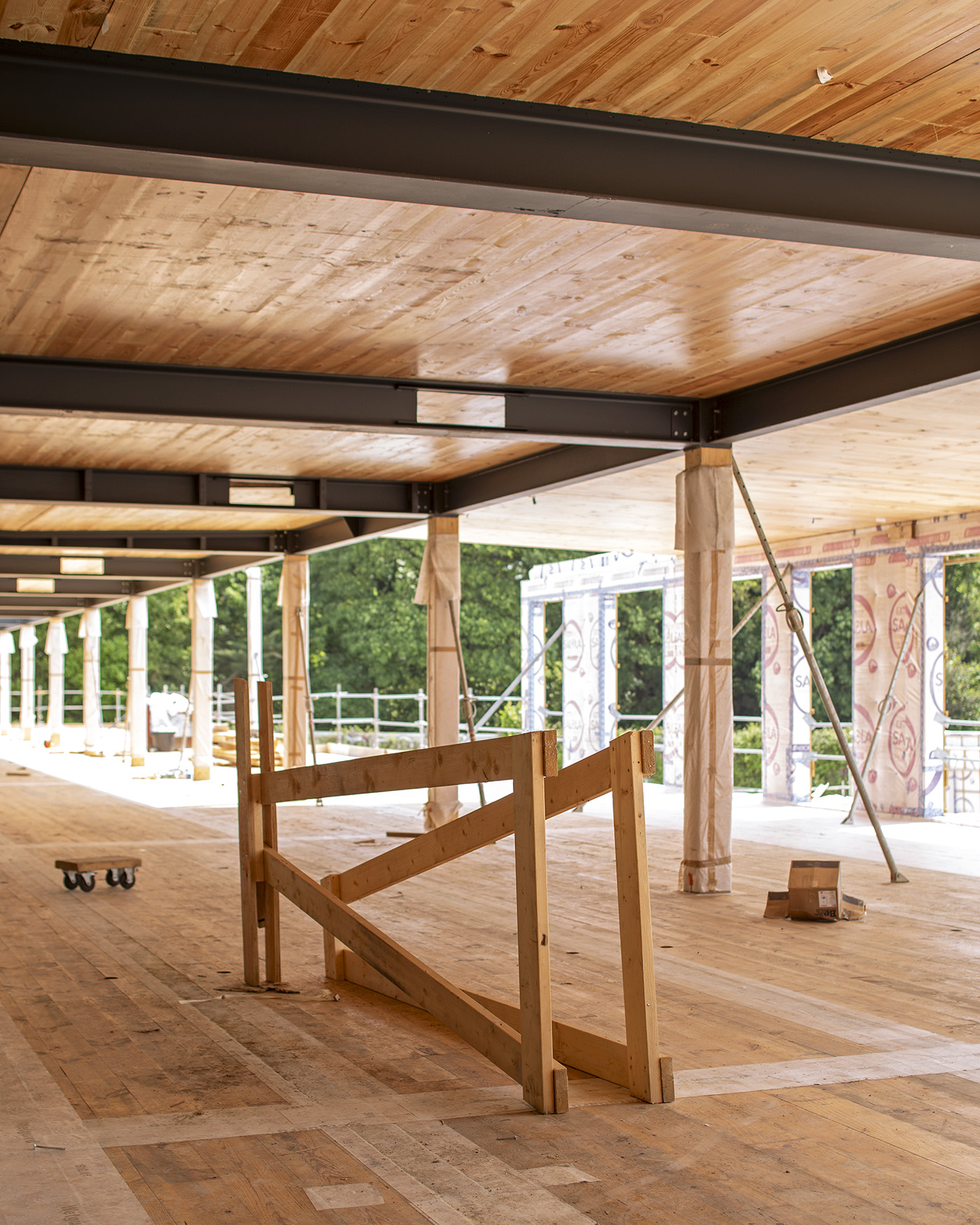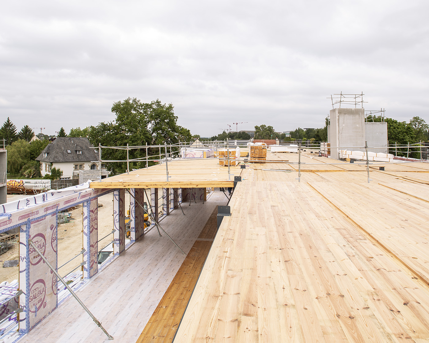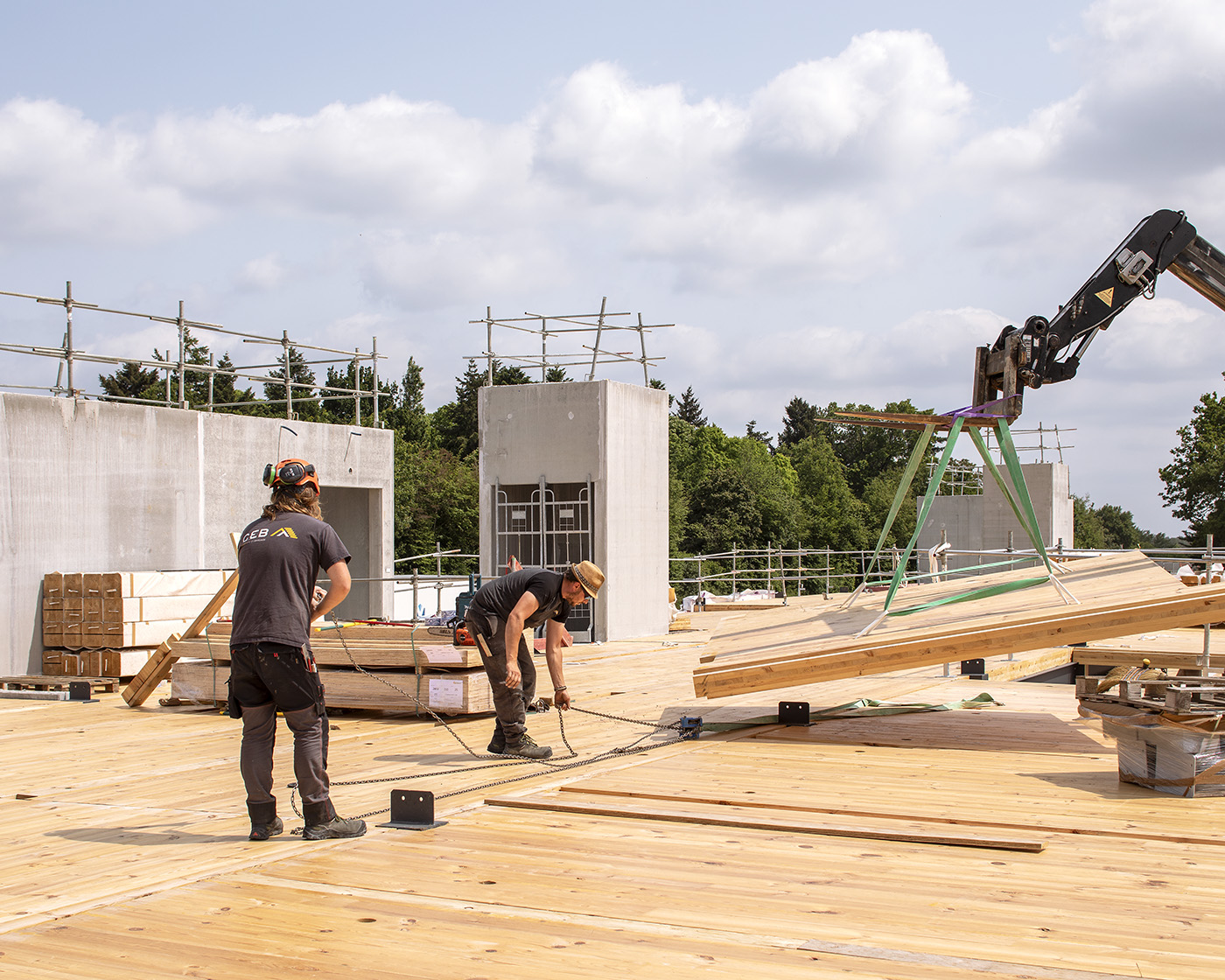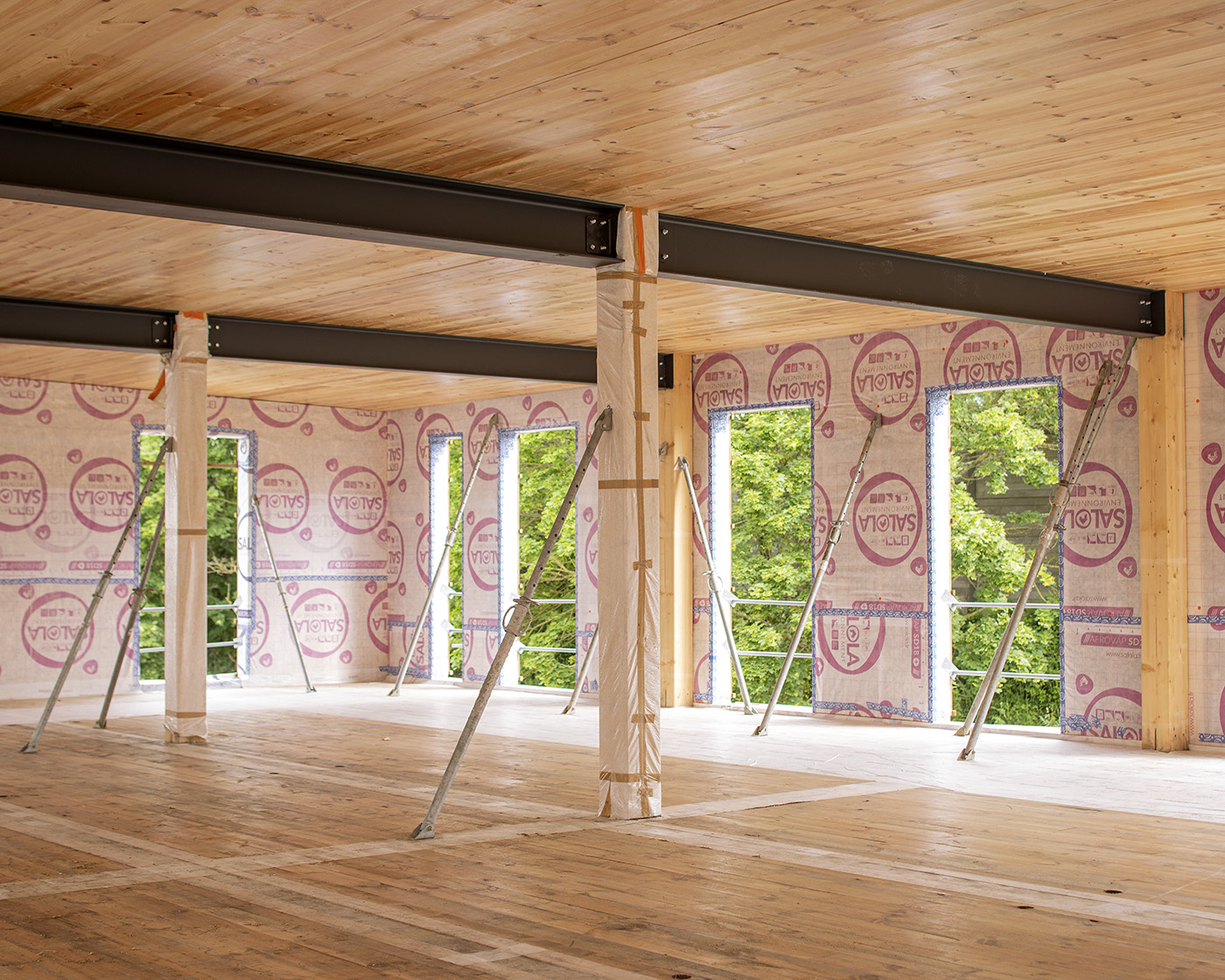 Ensuite, le métal est utilisé sous différentes formes, l’acier pour les poutres structurelles des plateaux, l’aluminium pour les menuiseries extérieures et la serrurerie des garde-corps et couvertine, le zinc naturel pour la couverture et descentes d’eaux pluviales. Enfin, le béton est utilisé ici ponctuellement dans le traitement des soubassements et des noyaux verticaux, permettant ainsi la stabilité de la charpente bois.