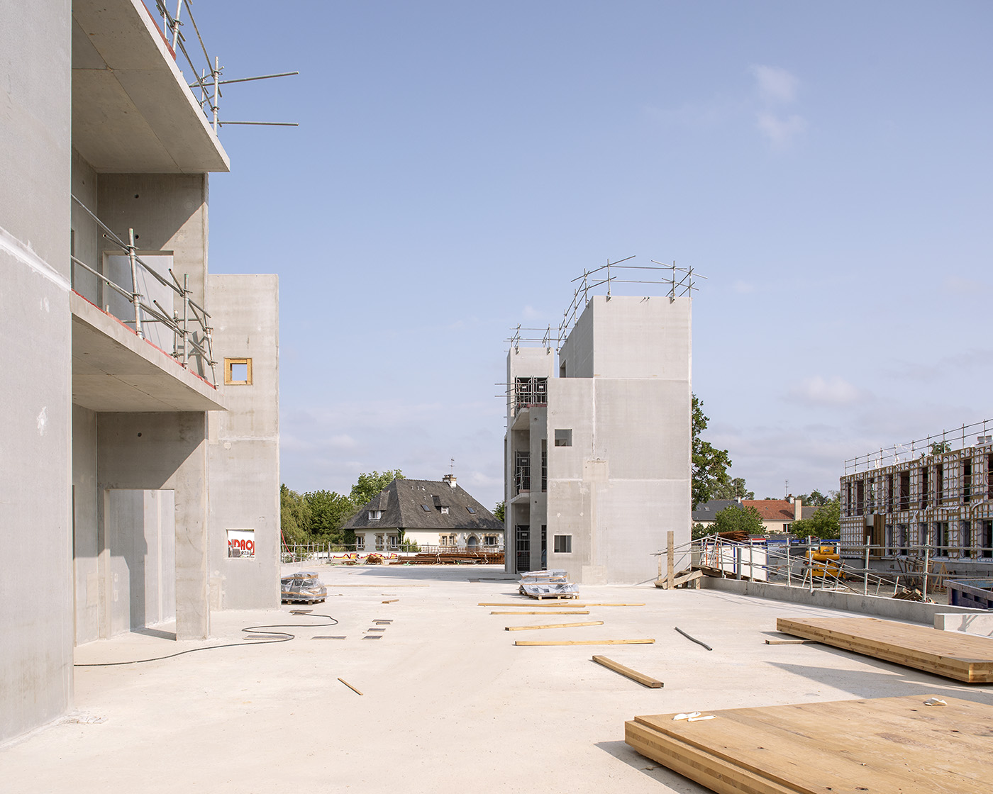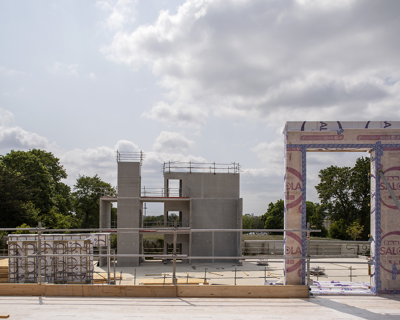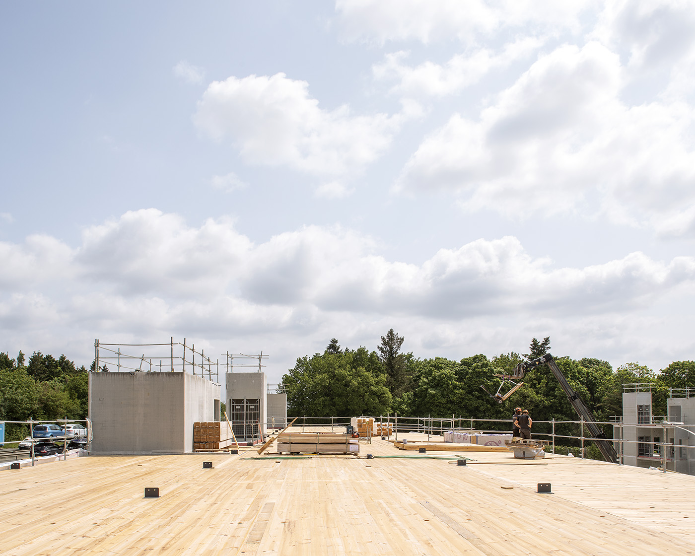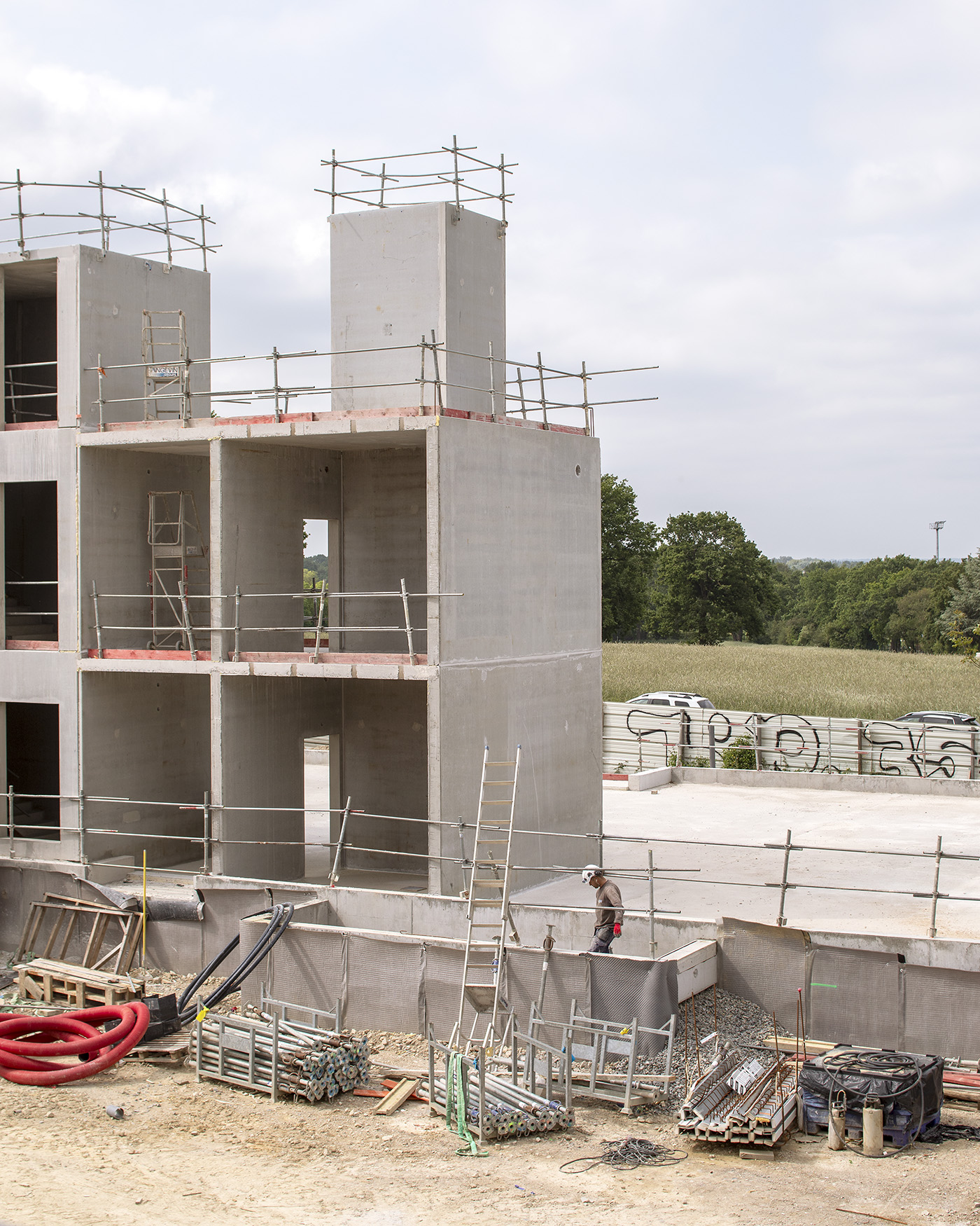 La captation du chantier du Bois Harel, fixe l’instant de la bascule entre le béton, la verticalité des circulations, et l’assemblage des éléments de la filière sèche, l’emboitement des modules préfabriqués. Les volumes, l’horizontalité, la puissance des perspectives intérieures se révèlent.