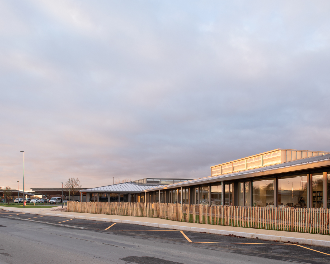 programme : 11 classes + salle polyvalente + locaux personnel + locaux technique + chaufferie géothermie + city stade + aménagements paysagers (jardin de pluie + éco pâturage ludique + espace éveil biodiversité + micro forêt)