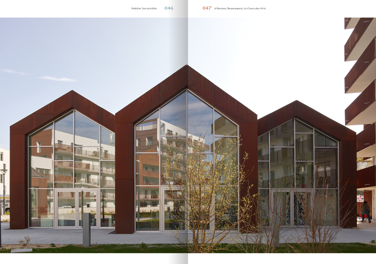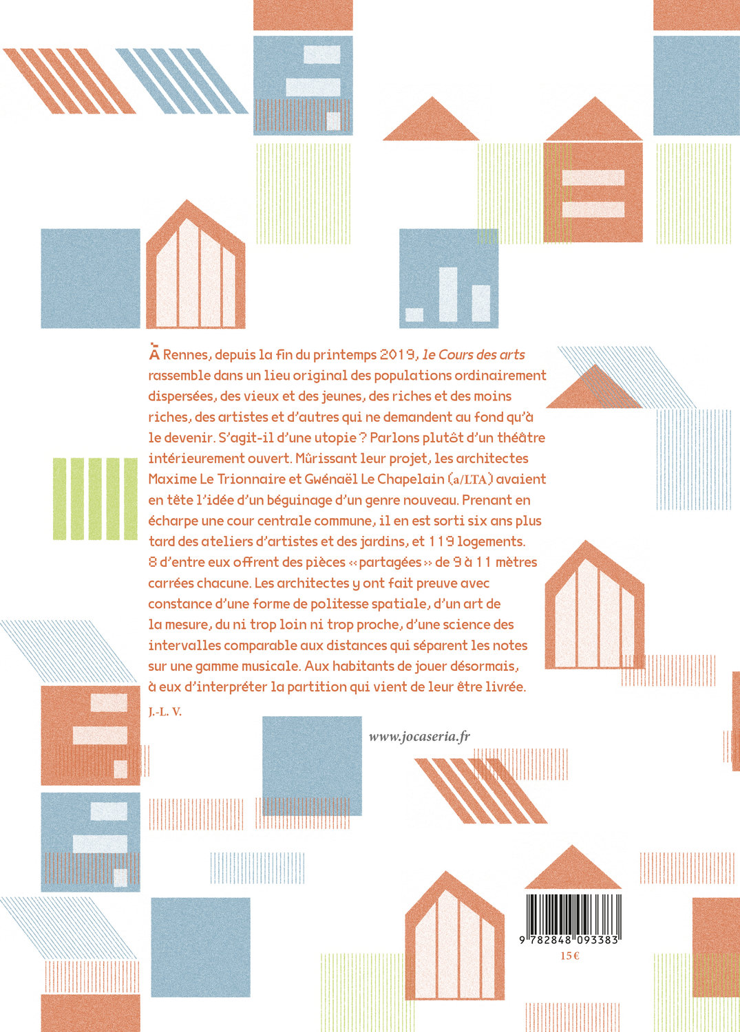« À Rennes, depuis la fin du printemps 2019, le Cours des arts rassemble dans un lieu original des populations ordinairement dispersées, des vieux et des jeunes, des riches et des moins riches, des artistes et d’autres qui ne demandent au fond qu’à le devenir. S’agit-il d’une utopie ? Parlons plutôt d’un théâtre intérieurement ouvert. Mûrissant leur projet, les architectes Maxime Le Trionnaire et Gwénaël Le Chapelain (a/LTA) avaient en tête l’idée d’un béguinage d’un genre nouveau. Prenant en écharpe une cour centrale commune, il en est sorti six ans plus tard des ateliers d’artistes et des jardins, et 119 logements. 8 d’entre eux offrent des pièces « partagées » de 9 à 11 mètres carrées chacune. Les architectes y ont fait preuve avec constance d’une forme de politesse spatiale, d’un art de la mesure, du ni trop loin ni trop proche, d’une science des intervalles comparable aux distances qui séparent les notes sur une gamme musicale. Aux habitants de jouer désormais, à eux d’interpréter la partition qui vient de leur être livrée.»