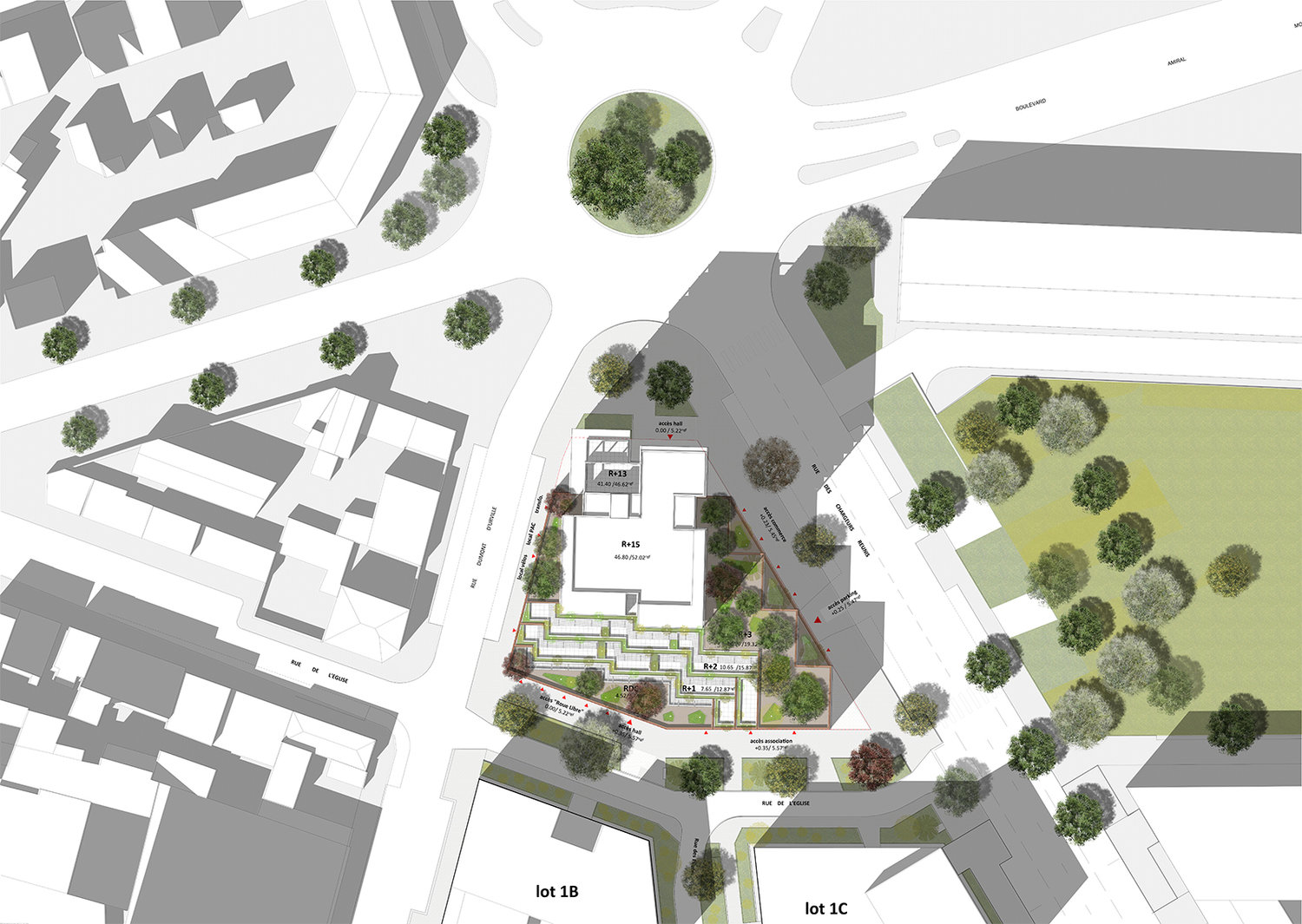programme : 52 logements + salle commune + locaux d’activités + cellules commerciales + parking