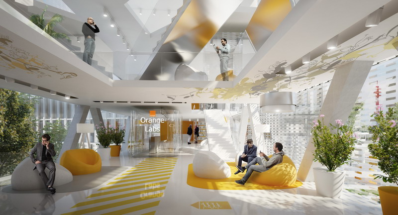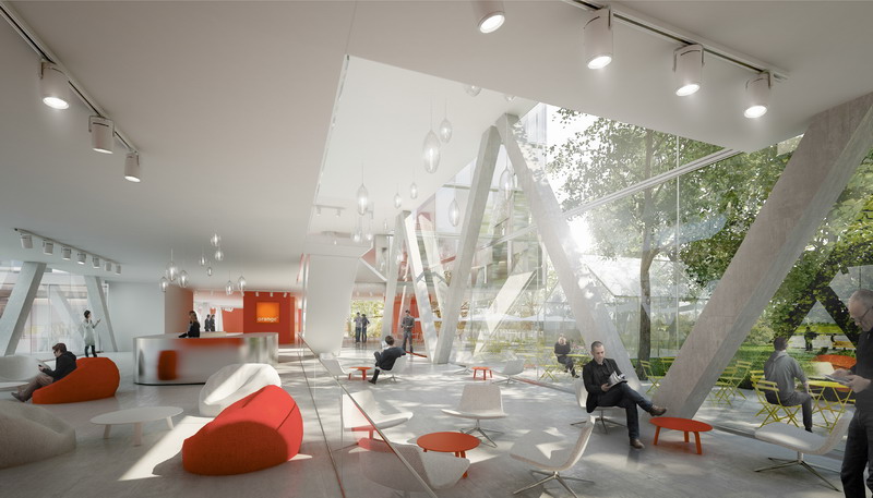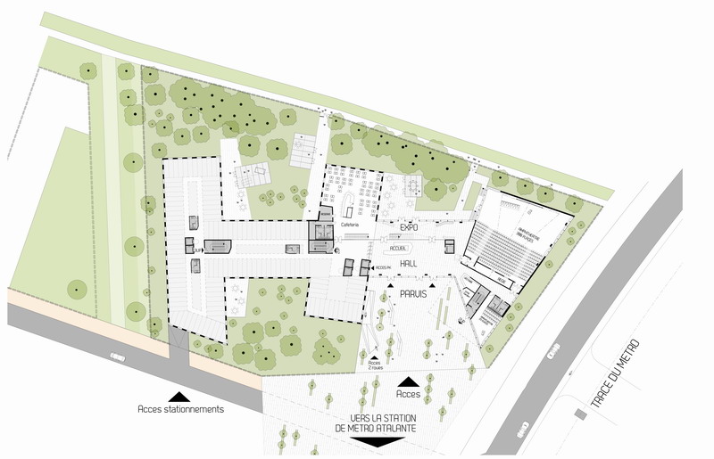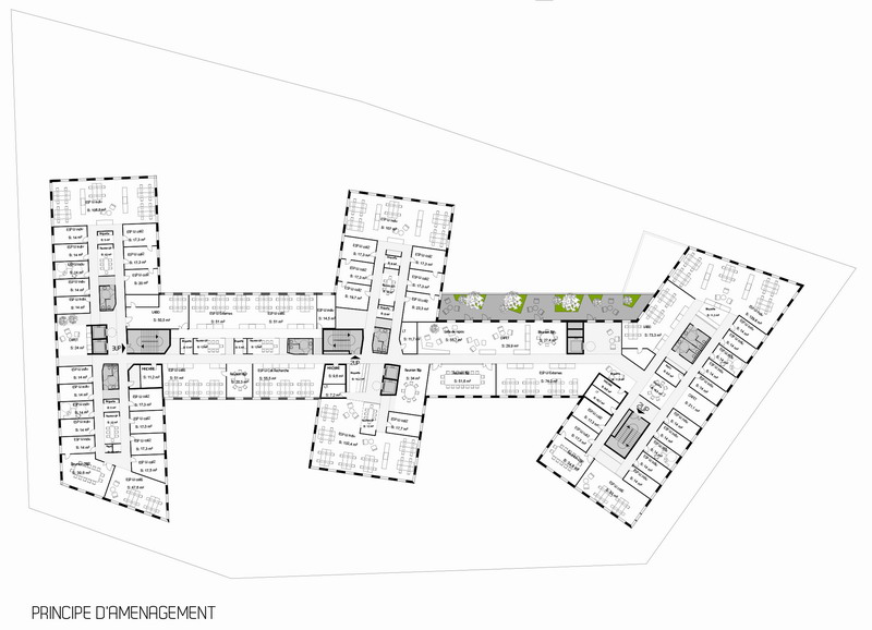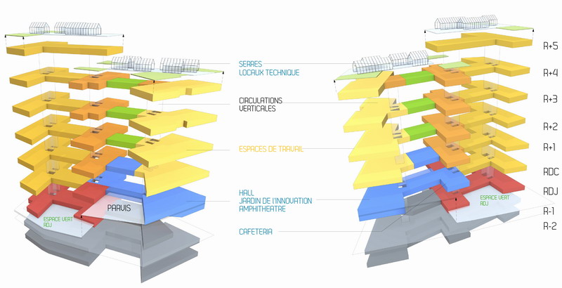 programme : bureaux + espaces de convivialité + cafétéria + amphithéâtre+ 2 niveaux de PK