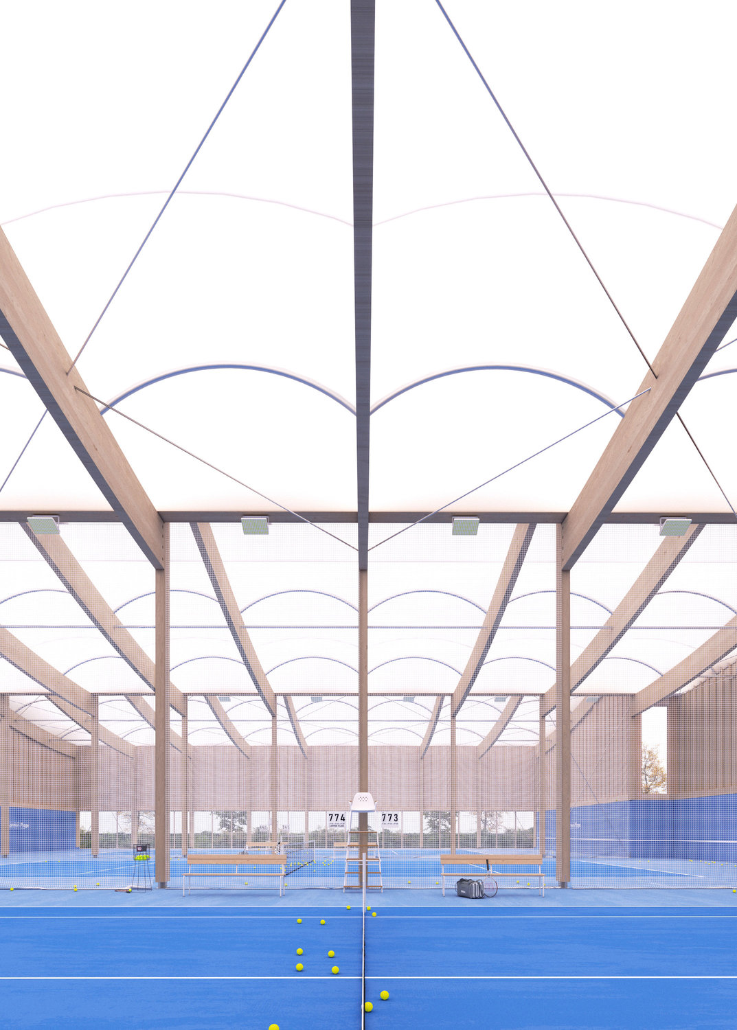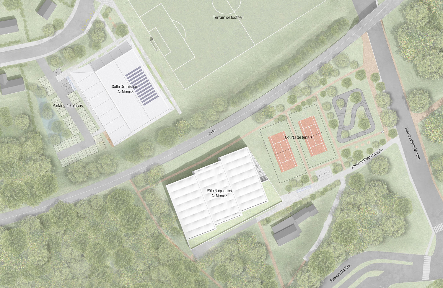 pôle raquettes : 3 courts de tennis + vestiaires + salle de réunion + club-house + restauration + locaux services